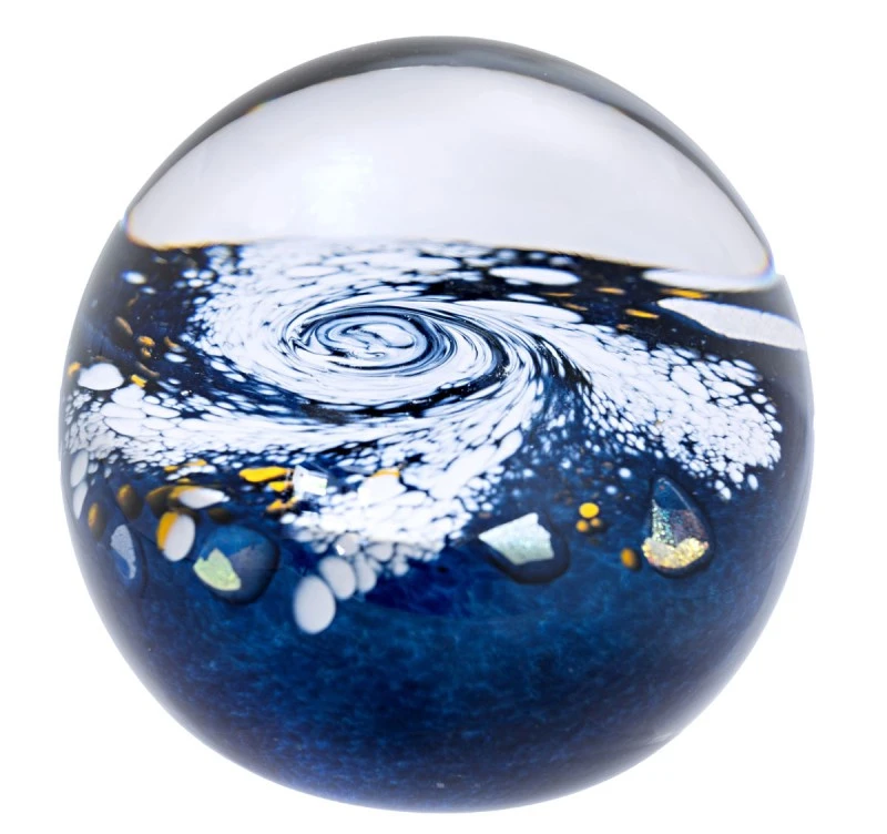 Recreate the celestial beauty of the Milky Way with this stunning paperweight from Caithness Glass. Handcrafted in Scotland, dark blue glass with wisps of white to depict an abstract vision of the Milky Way galaxy. Lighter shades and small white dots resemble distant stars sprinkled across the galactic design. This cosmic accent piece brings artistic flair and wonder to any desk or shelf. Part of the Abstract – Space collection.