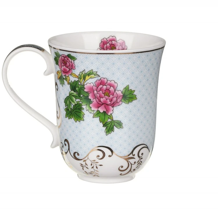 This ornate mug features full blooms of cerise pink, peony-like flowers on a pastel blue and white backdrop. The elegant white border around the bottom feature’s delicate gold leaf waves and leaves which is also used on the rim and handle. Inside the rim of this decorative floral mug is a repeat of the beautiful cerise peony.