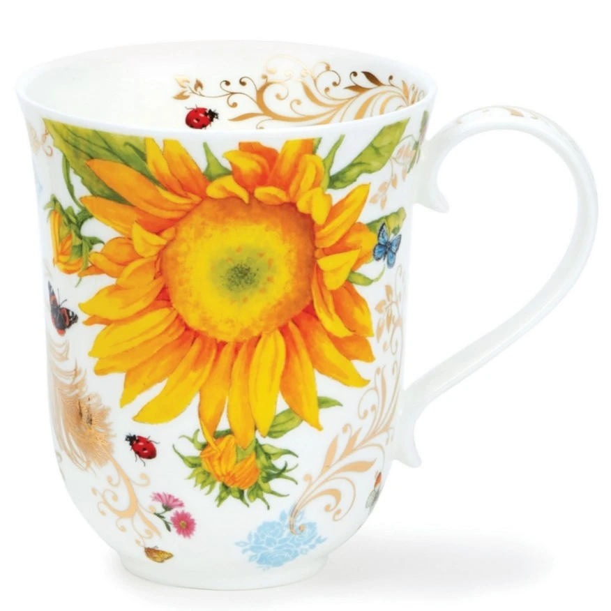 Vintage inspired florals with intricate, 22 carat metallic gold shapes, pretty butterflies and ornamental detailing scattered throughout. Yellow sunflowers are in full bloom on this design.