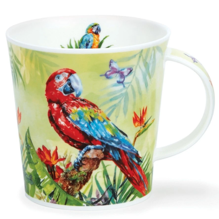 With a bright red macaw on the front and a blue-yellow macaw on the back, this bright and cheerful design has a light green background, with tropical foliage and some brightly coloured butterflies.